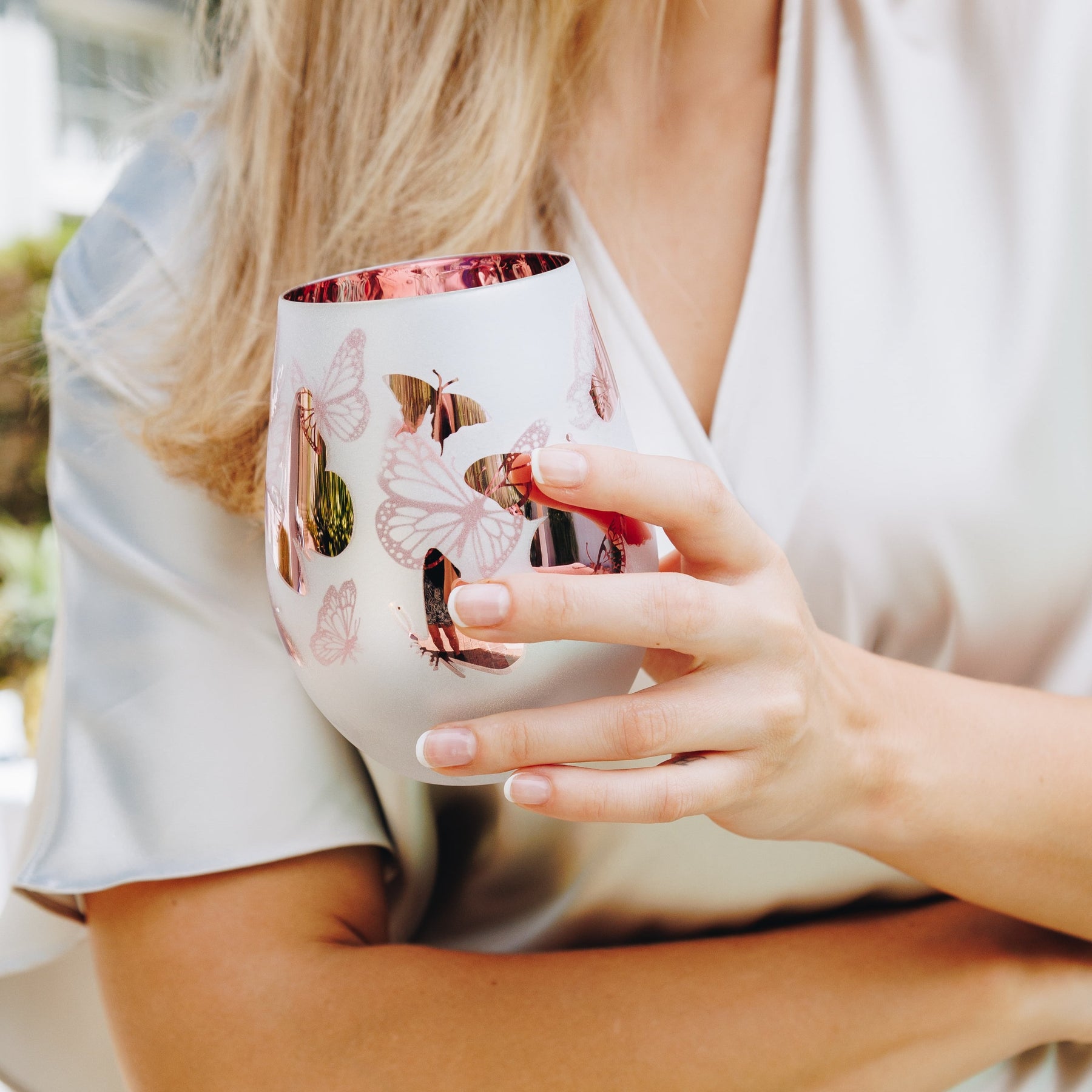 Engraved with a scene of flying butterflies, these beautiful glasses are designed with a shimmery silver & rose pink finish, and a dazzling pink interior that will light up the room.