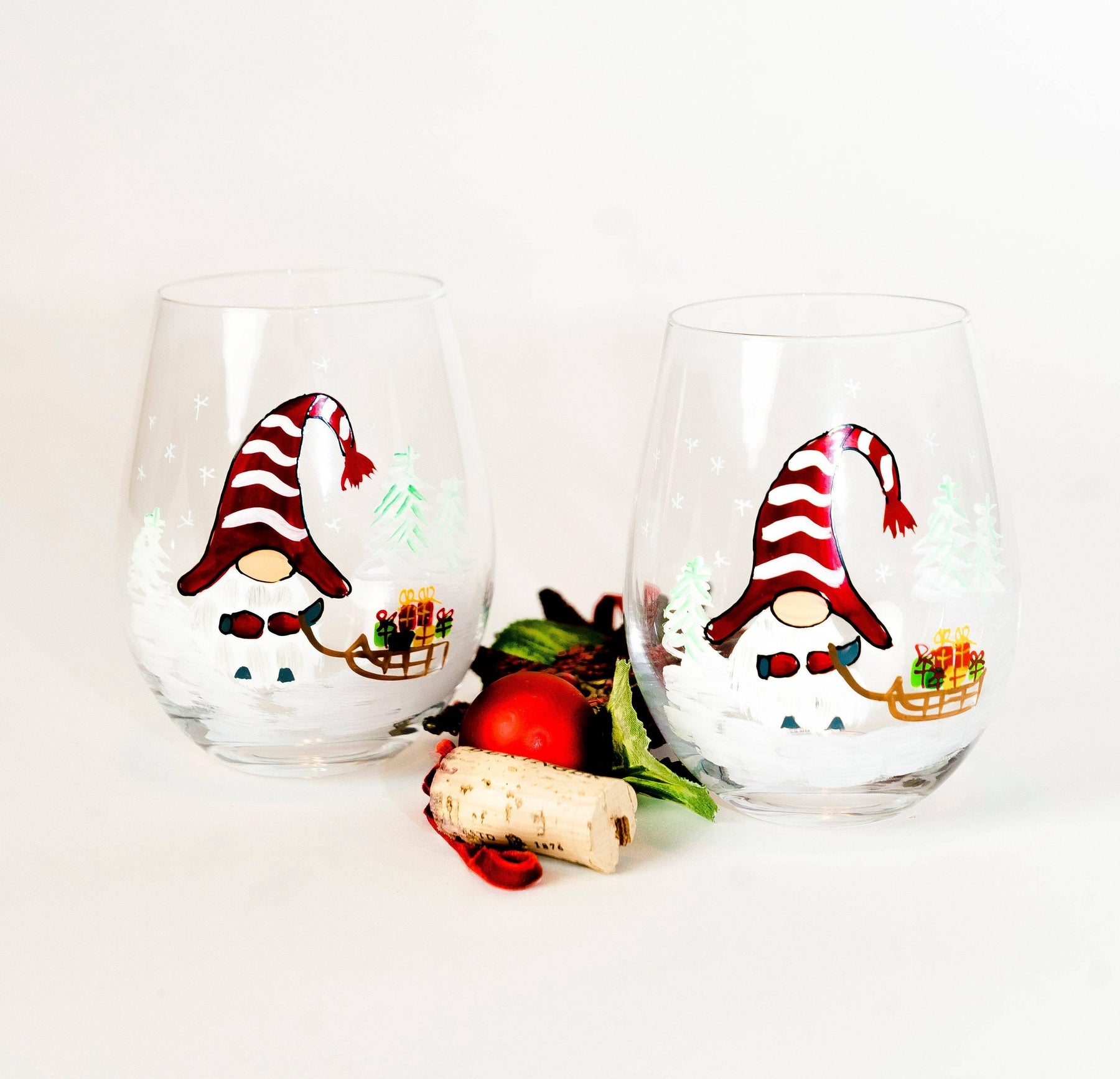 Embrace the playful spirit of the holidays with our Christmas Gnome Stemless Glass Set. Each glass beautifully depicts a cheerful gnome, hand-painted with precision, holding a sled brimming with presents.
