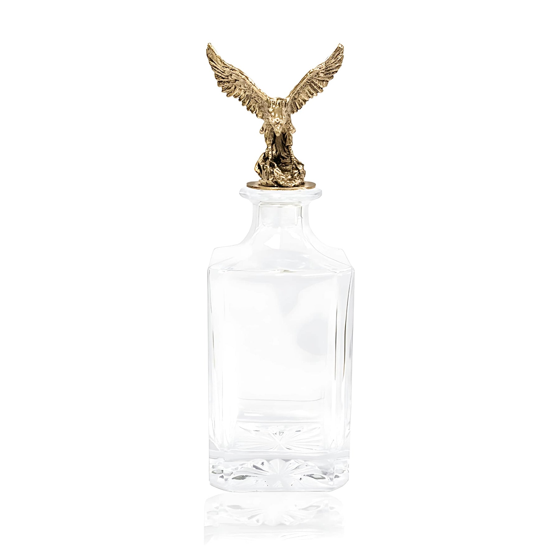 Designed in brass with a gold finish, a majestic eagle proudly sits on the large crystal clear decanter.