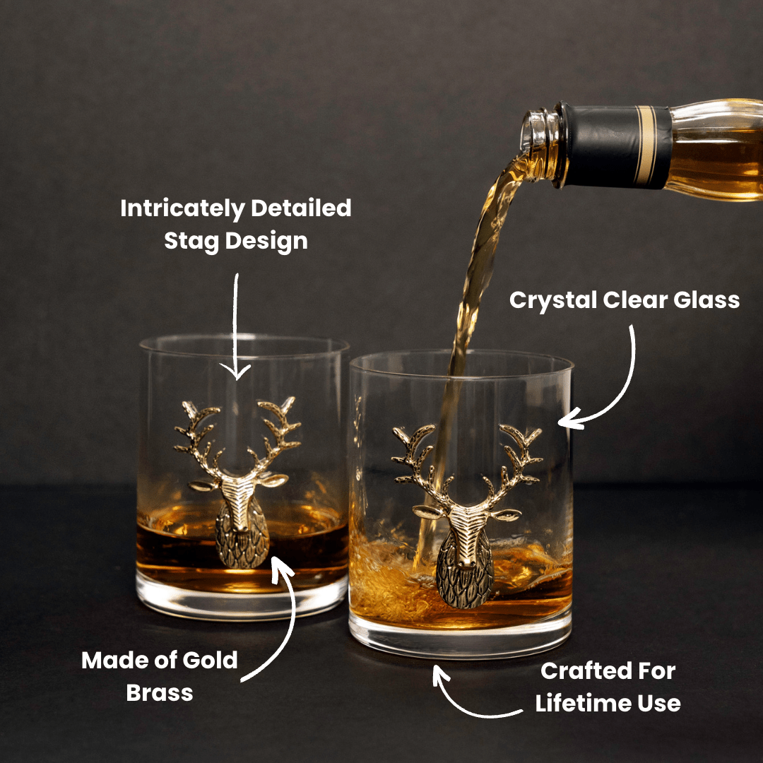 Elevate your drinking experience with our Gold Stag Deer Decanter and Whiskey Glasses bundle. Crafted in brass with a dazzling gold finish, these pieces feature a majestic deer motif that exudes elegance and sophistication.